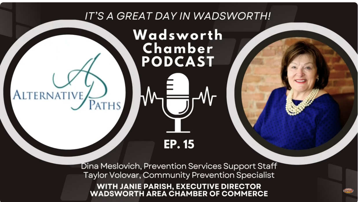 Wadsworth Chamber of commerce Podcast with Janie Parish featuring Dina Meslovich and Taylor Volovar. (Community Prevention Specialsts at Alternative Paths.)